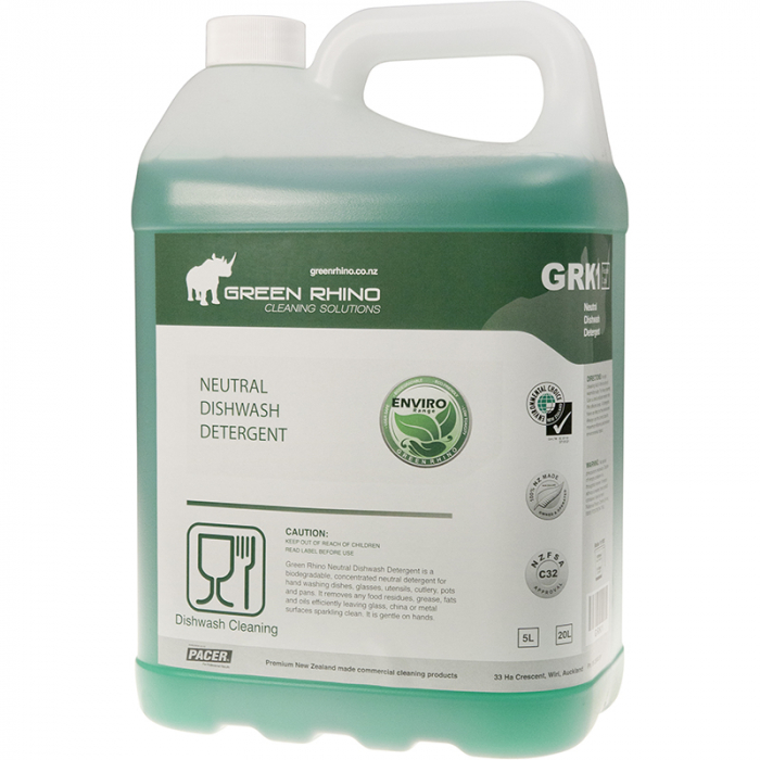 Green Rhino Neutral Dishwash Detergent is a biodegradable, concentrated neutral detergent for hand washing dishes, glasses, utensils, cutlery, pots and pans. It removes any food residues, grease fats and oils efficiently leaving glass, china or metal surfaces sparkling clean. It is gentle on hands