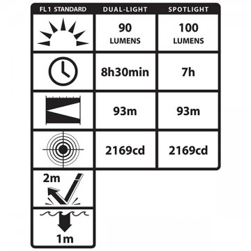 The EH-DLH Dual-Light' Headlamp features a multi-position tilt head design. A single top mounted switch activates a 100-lumen spotlight for distance illumination mode, a 45-lumen close area floodlight mode and a 90-lumen dual-light mode that turns both the spotlight and floodlight on at the same time. Designed for heavy trades usage, but not where intrinsically safe certification is required.
