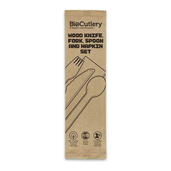 16cm Knife, Fork, Spoon and Napkin Set, FSC 100%, Wood - BioPak