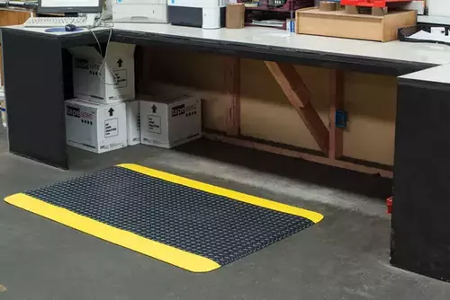 Diamond Plate is an excellent alternative offering unparalleled comfort, plus a high tech look and a great abrasion and chemical resistant top. A deeply embossed PVC surface with vinyl sponge base gives excellent anti-fatigue properties and reduces employee fatigue. Plus the matting has bright contrasting yellow edges for safety awareness.