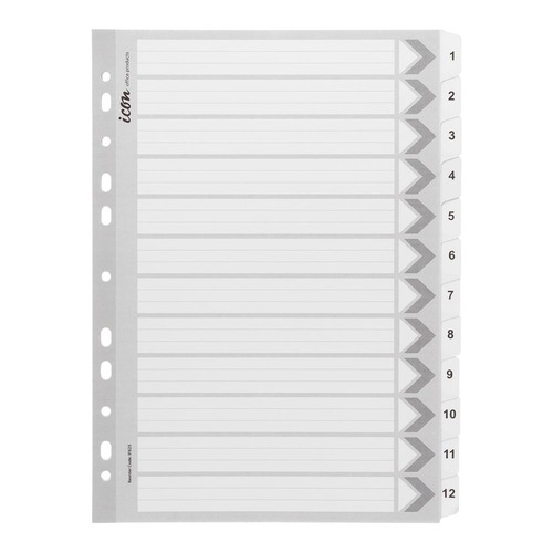 Icon Cardboard Dividers are great for organising work and projects. Dividers with reinforced plastic tabs, designed for heavy duty use. Multi punched reinforced spine for use with all ring binders. Comes with a seperate contents page for easy referencing. 1-12 numerical tabs. A4 size. Black and White colour.