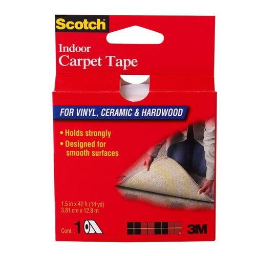 Scotch Indoor Carpet Tape CT2010. This permanent tape is designed for smooth surfaces. Designed for permanent use on vinyl, ceramic and hardwood floors. Ideal for applications where there are no plans to change flooring in the future. 38mm x 12.8m.