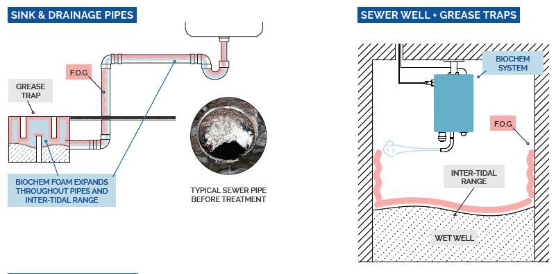 Liquid bacteria work – just not effectively in the fast flowing water column. Liquid-based bacteria require large concentrations to make a difference and are quickly flushed away down stream requiring constant re-dosing – a costly exercise that’s not viable in the practical world. Through the use of an expanding foam, concentrated bacteria and readily biodegradable surfactants, we are able to target the problem areas – the inter-tidal range, walls, equipment and top of pipes.